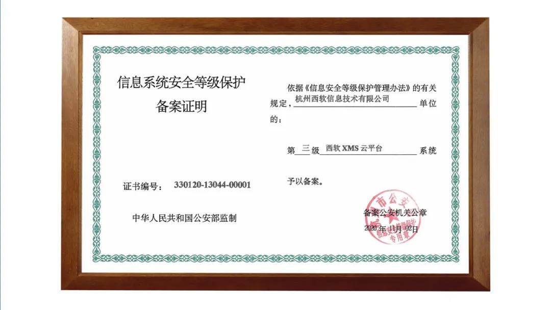 ▲西软云XMS:获得公安部核准颁发的《信息系统安全等级保护三级备案证明》(即三级等保),成为国内酒店信息系统板块率先获此认证的公司